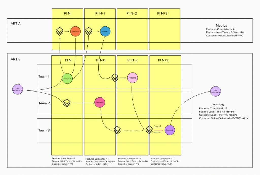 As PI N+1 got started both ART A and Team 2 in ART B began working on and completing their Features. Once those were done Features E and F were created and worked in the next PIs. Finally, after 4 Program Increments, which is one year in calendar time, the Outcome was finally achieved.