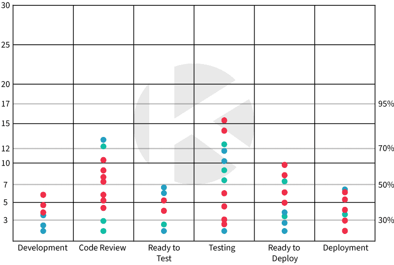 This visualization displays the states of your workflow on the horizontal axis and the age of work items in days on the vertical axis. Each dot on the chart represents a single work item currently in progress, plotted using its current workflow state and its age.